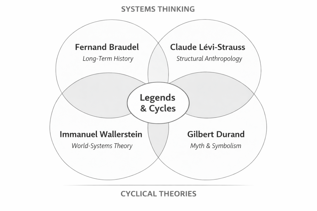 Legends & Cycles is grounded in a converging intellectual tradition that brings together structural analysis, long-term historical cycles, and the study of symbolic systems.