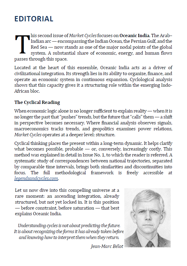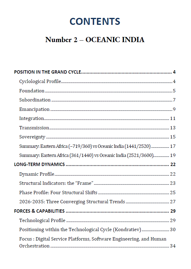 This second issue of the Market Cycles collection focuses on Oceanic India — a continental-scale civilization entering a phase of systemic integration within the Indo-Pacific architecture. The study brings together: