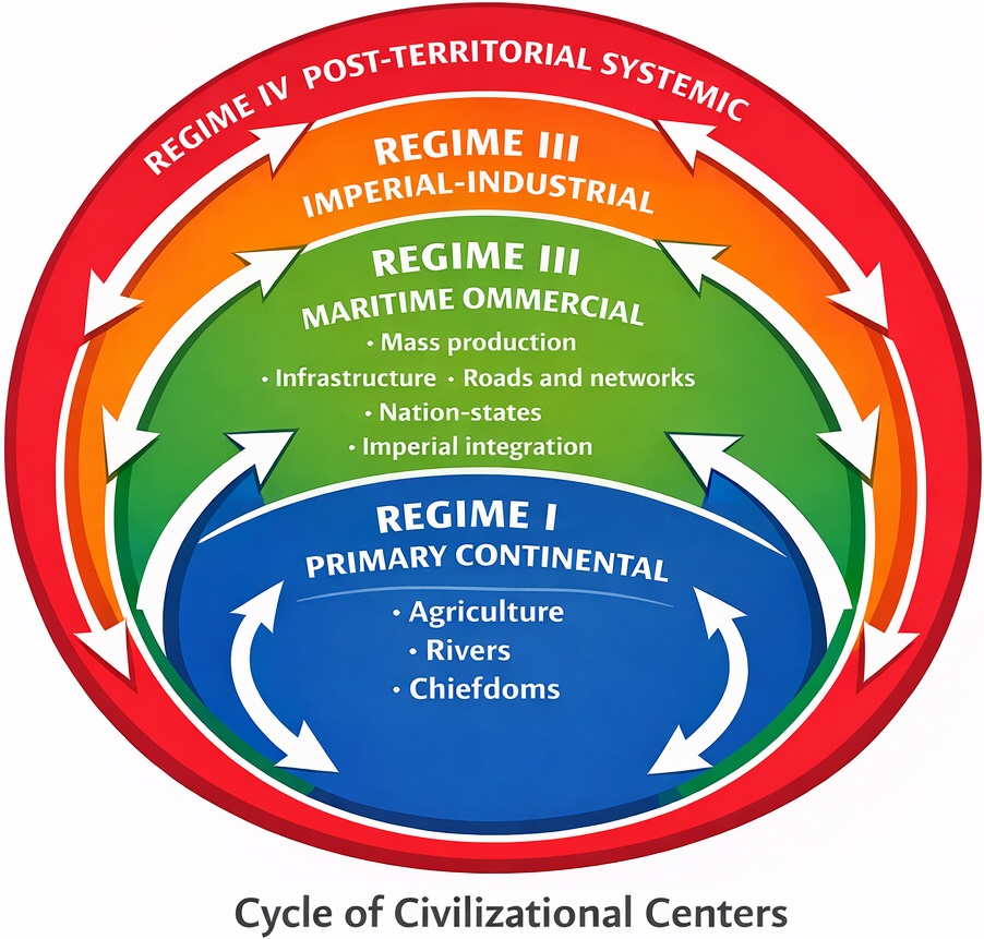 🔮 Prospective implication. When read through this framework, current configurations suggest the emergence of a Northern China–Korea axis as a future hard center, while the United States increasingly plays a role analogous to late-cycle Italy: structurally central, but no longer the primary locus of regime innovation. In this context, the notion of a “new America” no longer refers to a continent, but to a systemic frontier — orbital, technological, and informational. General principle. A civilization does not progress where it was born. When a regime saturates, its center relocates — not randomly, but according to structural compatibility with the next dominant system.